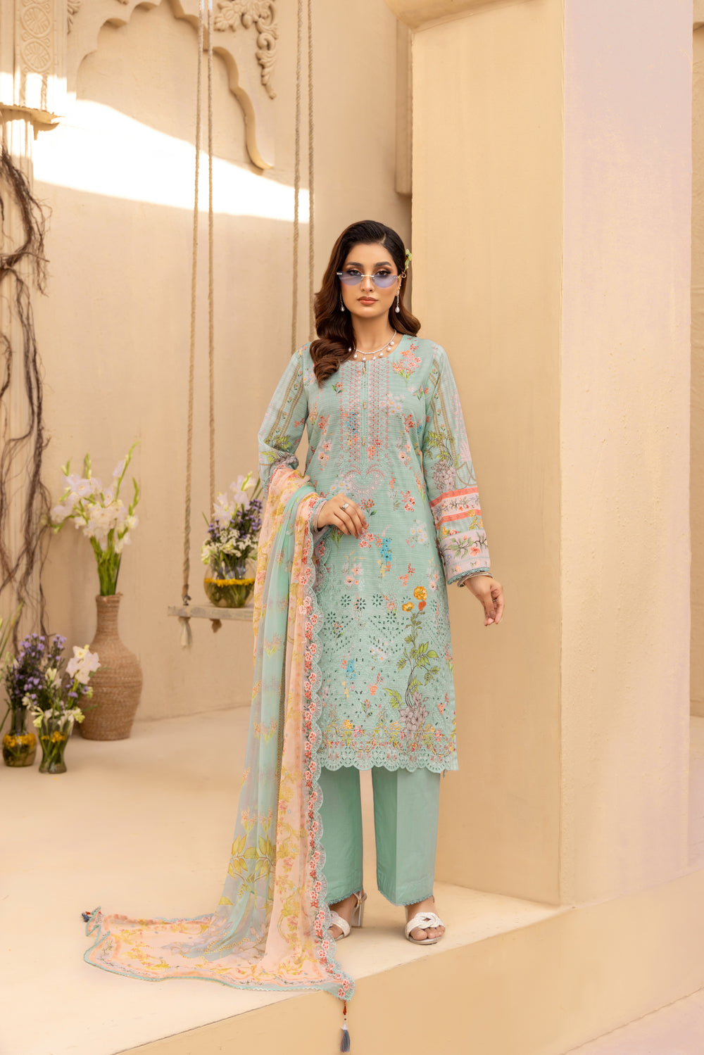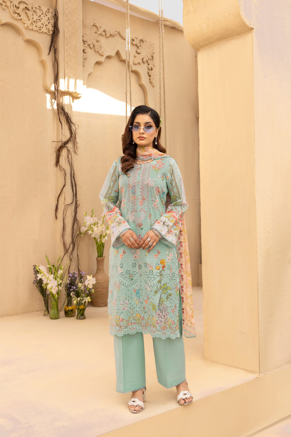 Step into serenity with this sky-blue embroidered outfit, featuring detailed craftsmanship and soft tones that evoke calm and elegance. A perfect choice for a fresh, elevated everyday look.