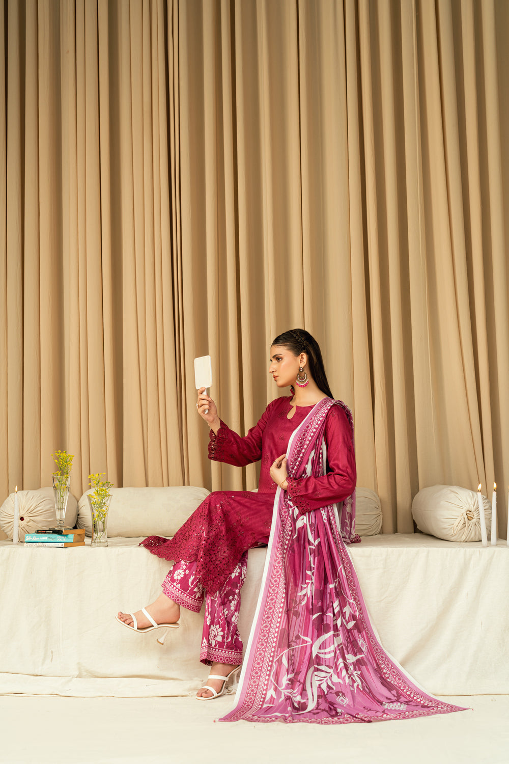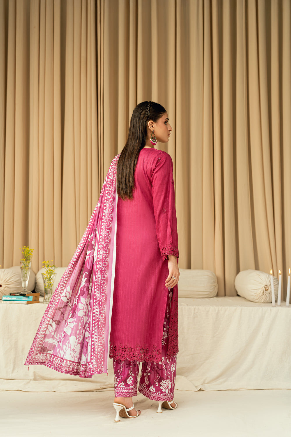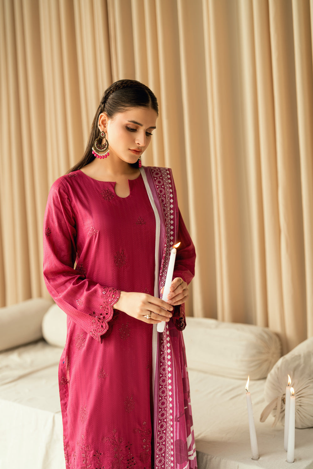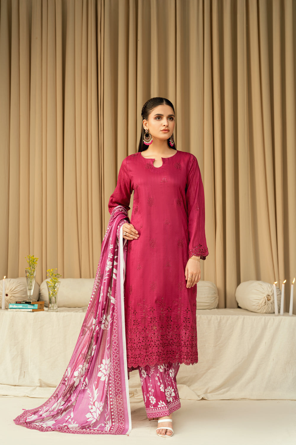Add a pop of color to your wardrobe with this magenta suit. The vibrant hue and traditional embroidery make it a standout choice for festive occasions and celebratory gatherings.