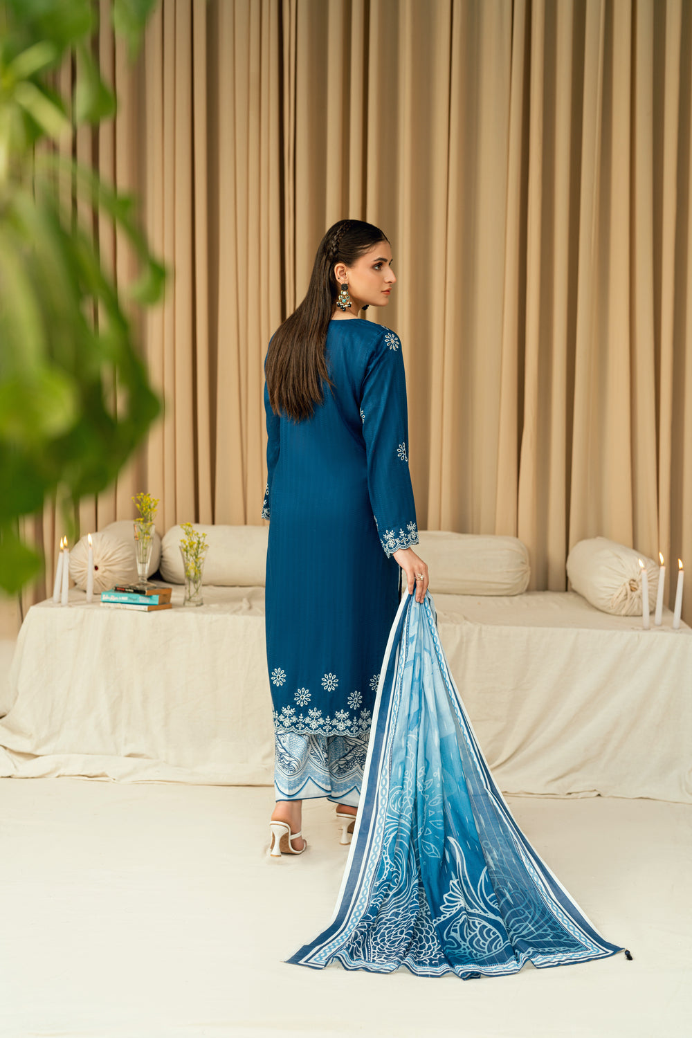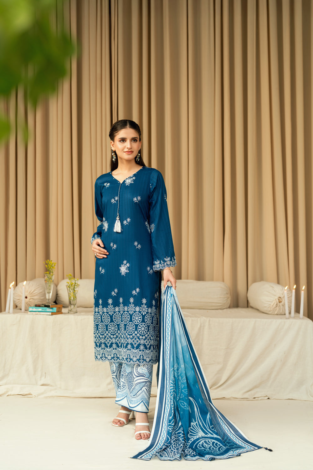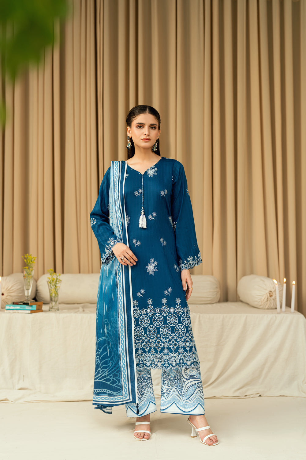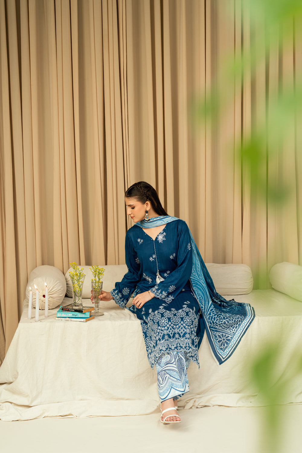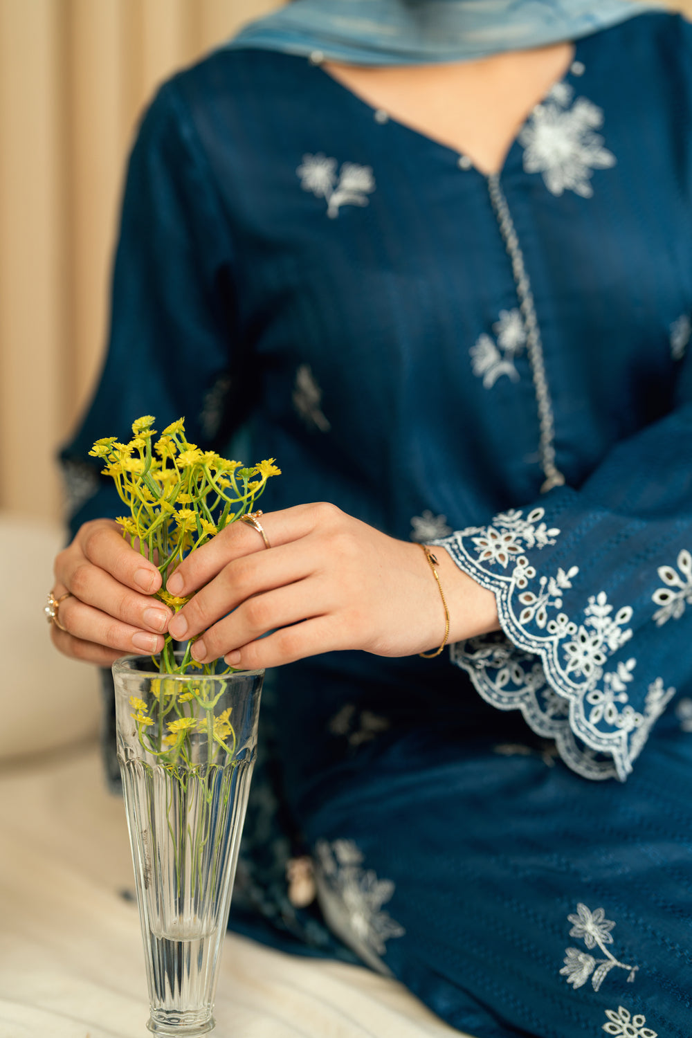 Make a bold statement with this navy blue embroidered suit. The rich tone paired with intricate detailing reflects elegance, while the flowy silhouette ensures comfort. Perfect for evening occasions and festive nights.