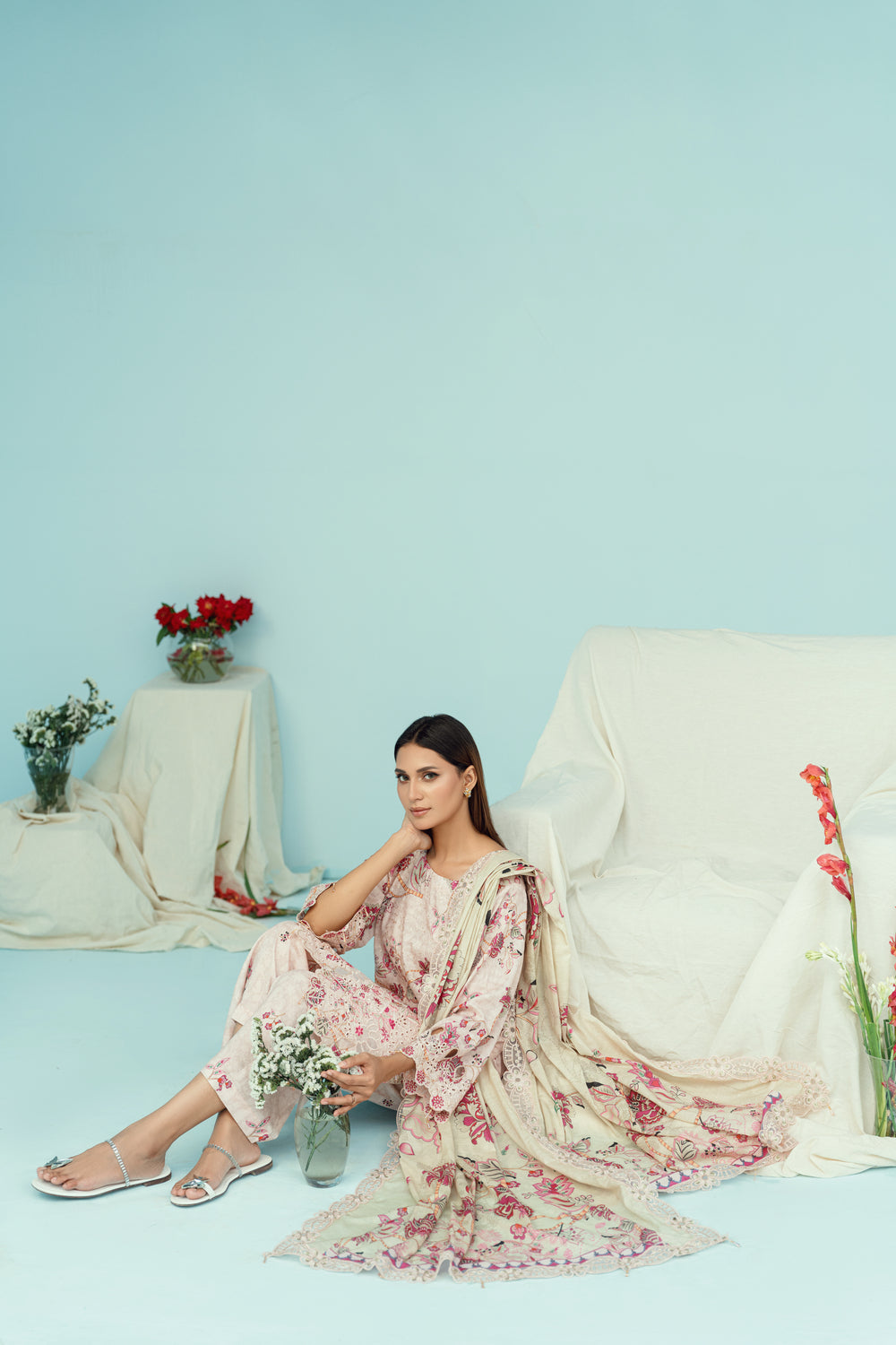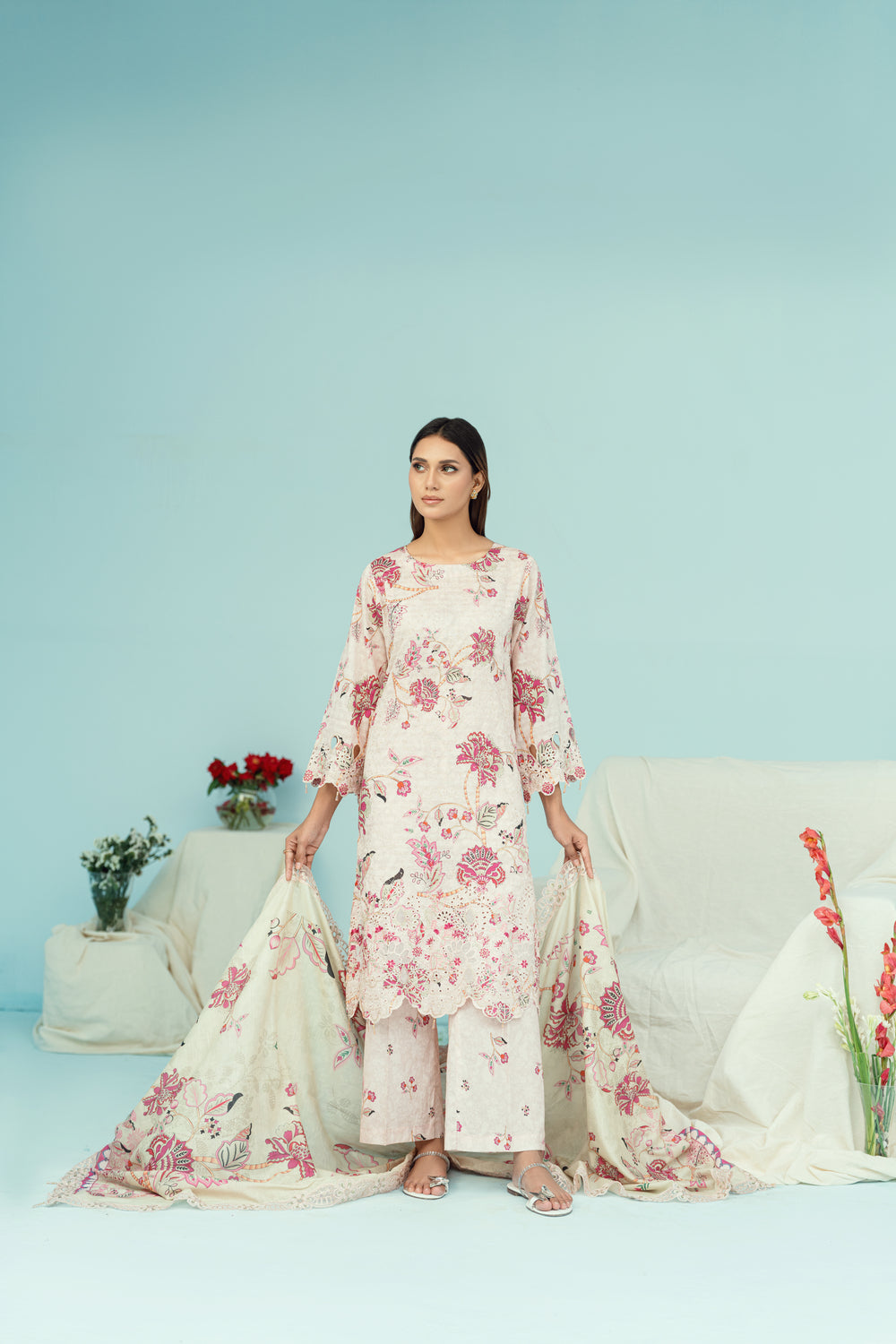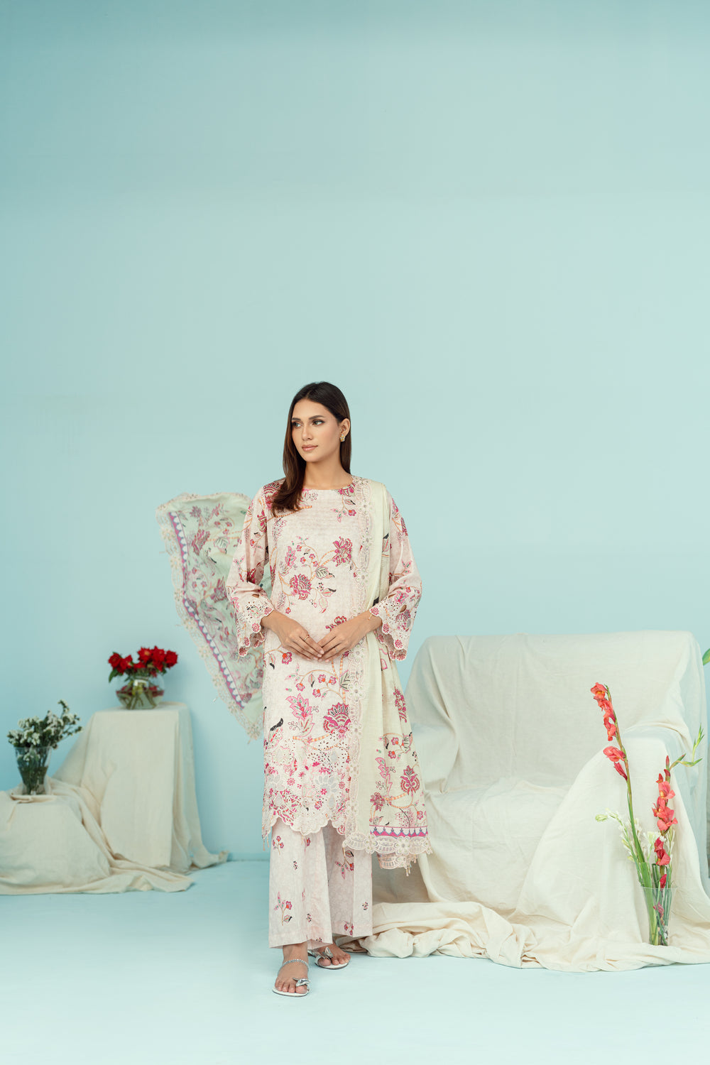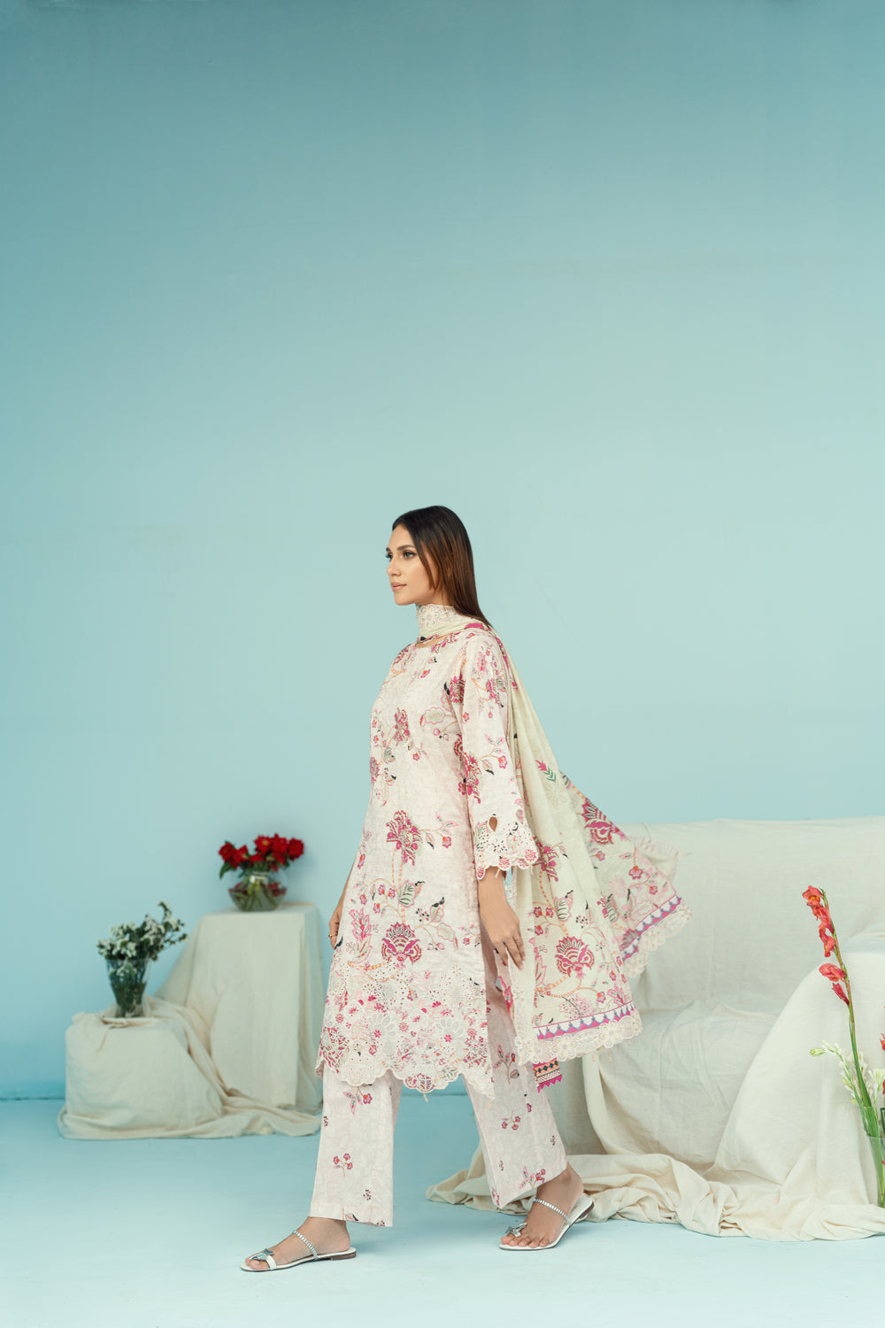 Exude elegance in this soft pink ensemble featuring delicate floral prints. The matching trousers and lightweight dupatta complete the graceful look, perfect for tea parties, casual wear, or semi-formal occasions.