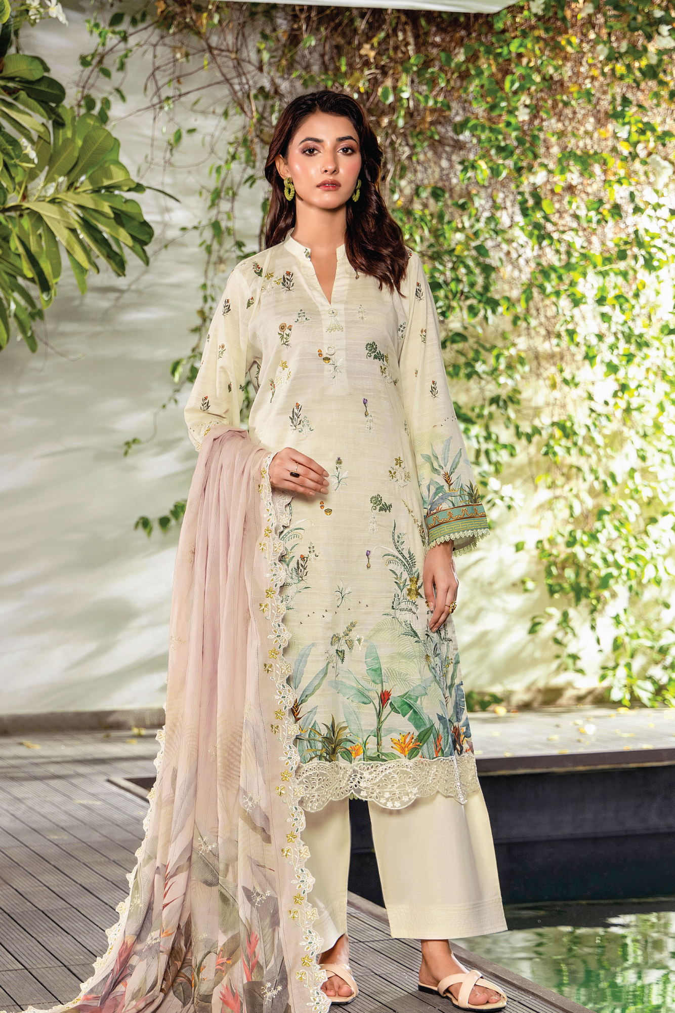 Step into summer with Sahiba, a stunning combination of pastel hues and floral embroidery. With its airy fabric and vibrant details, this design is ideal for those who want to look effortlessly chic at both daytime and evening occasions.