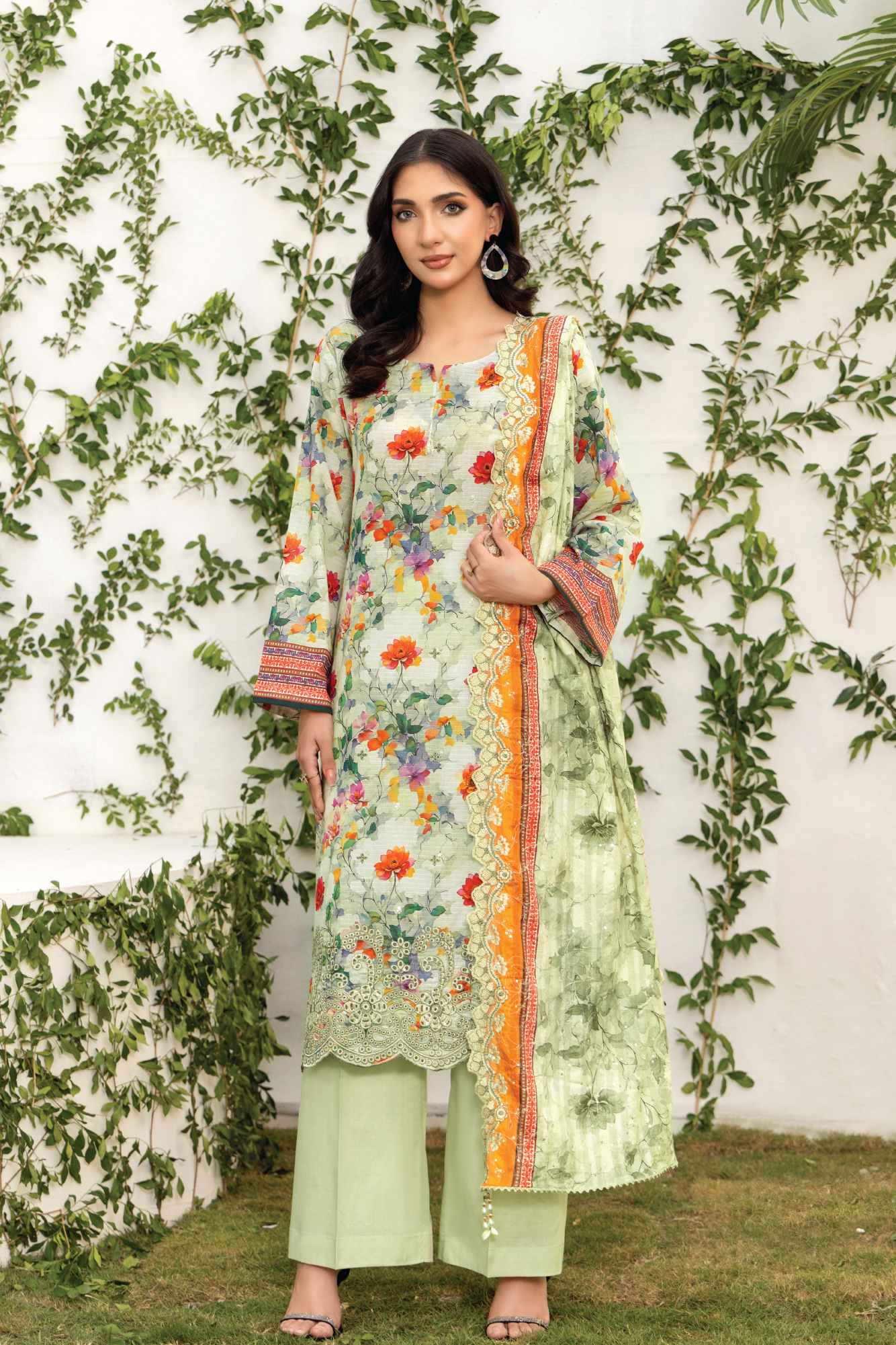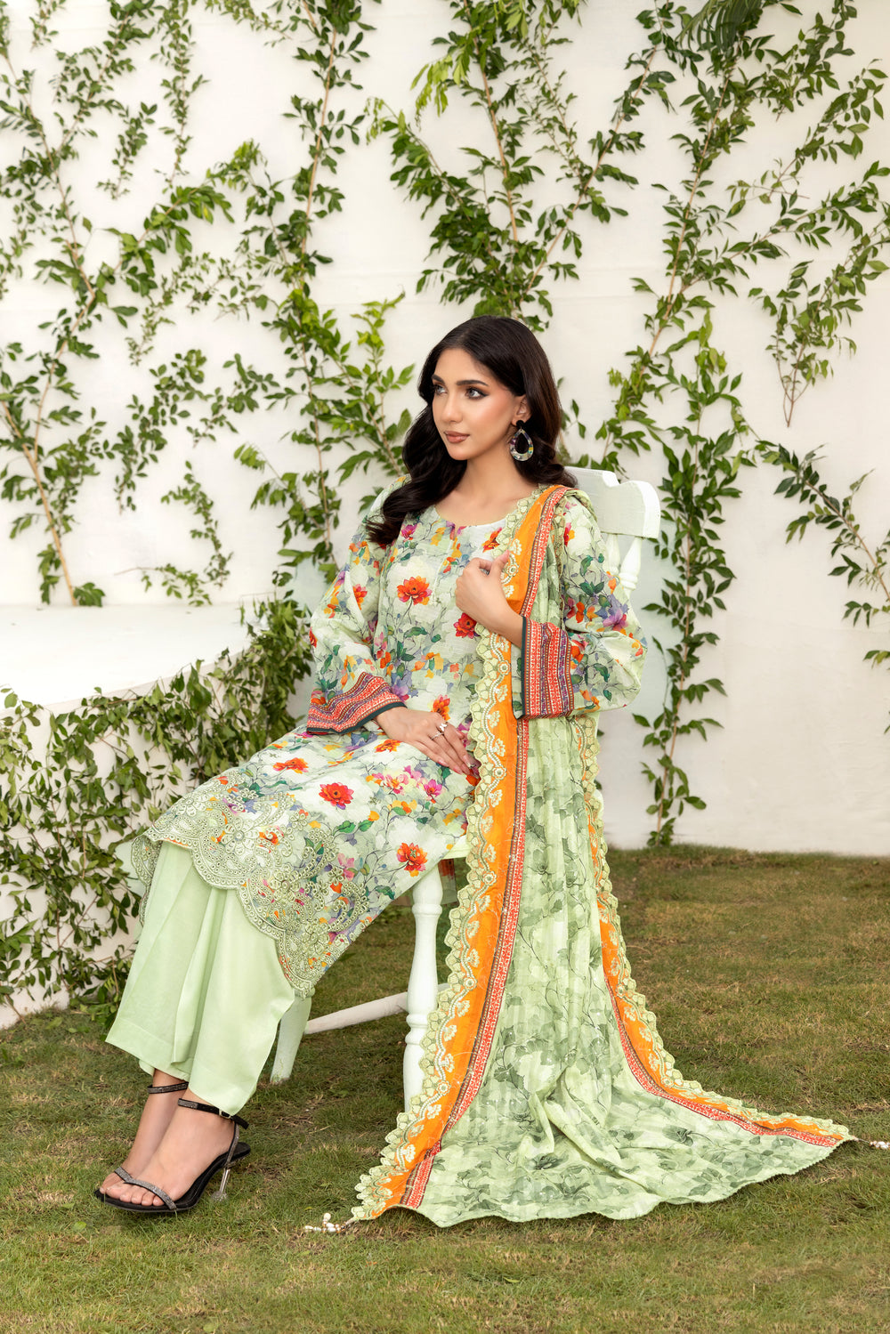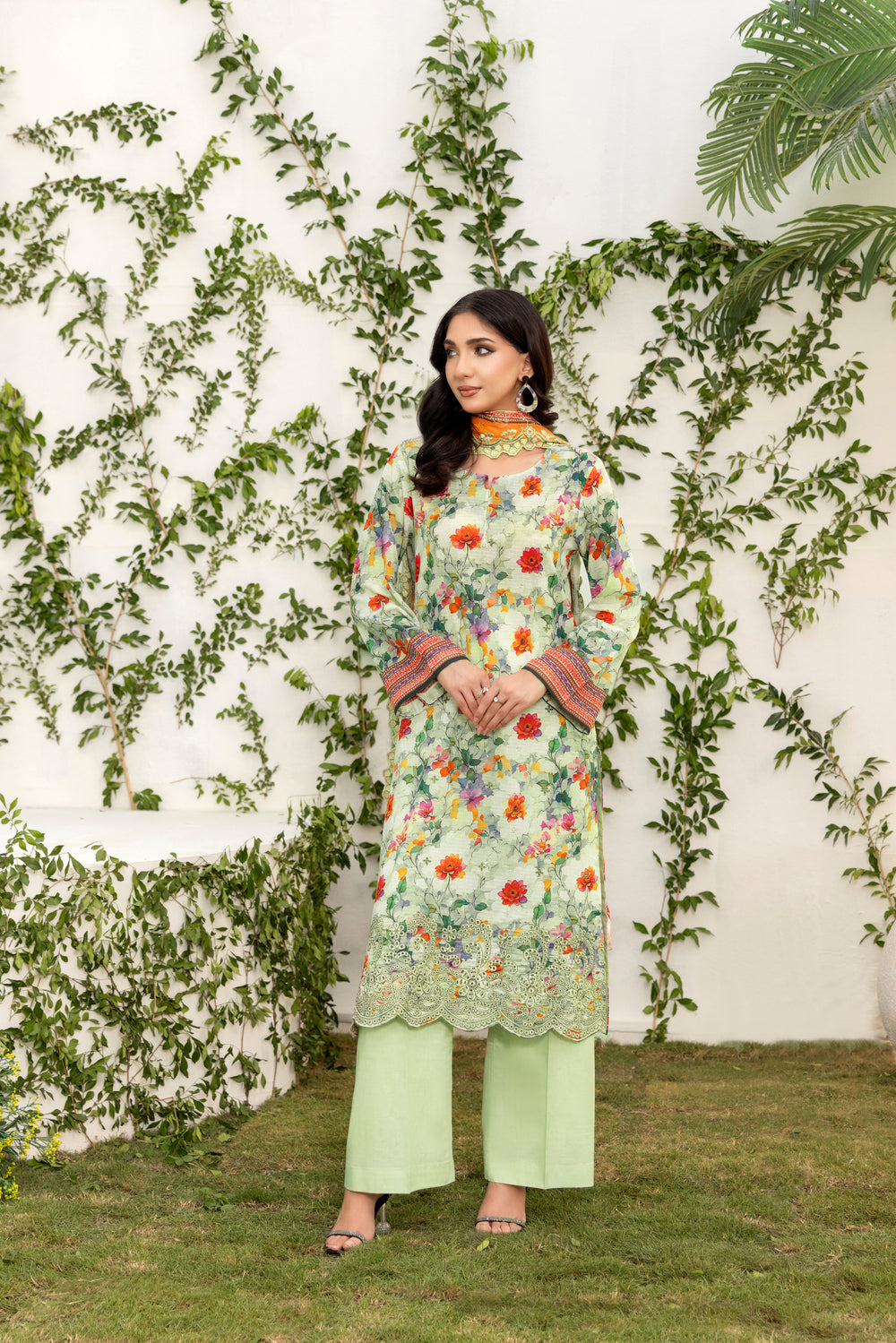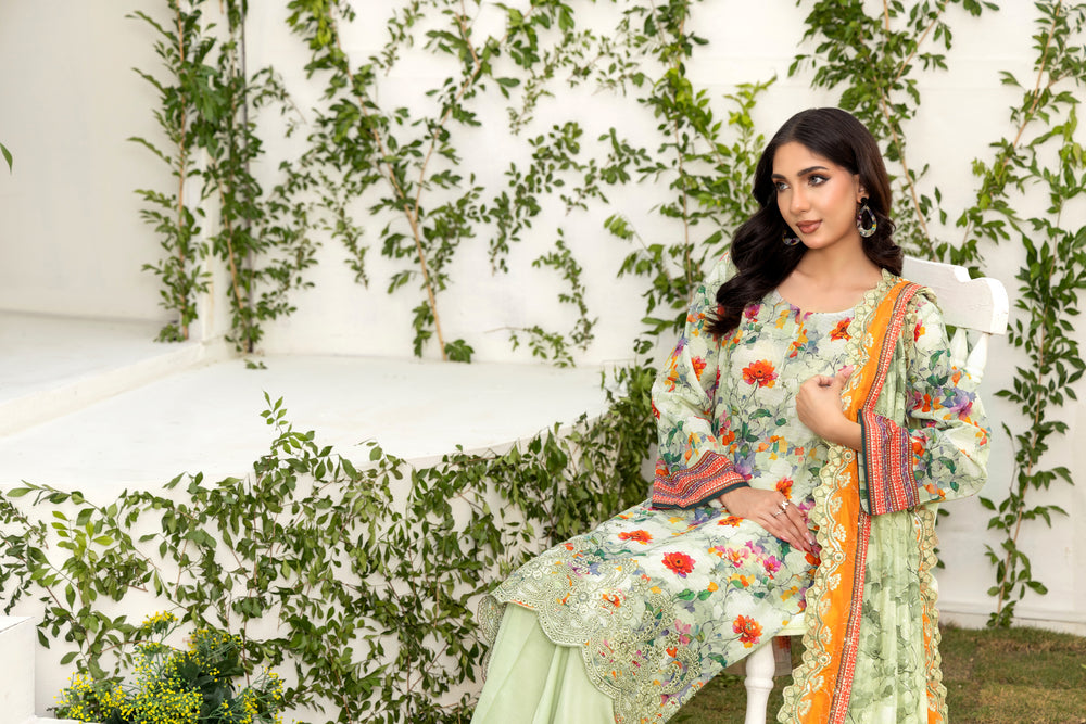 A soft GREEN outfit blooming with floral motifs — radiant and feminine.