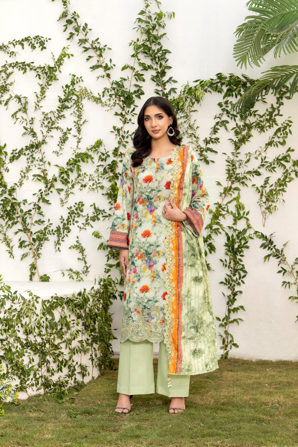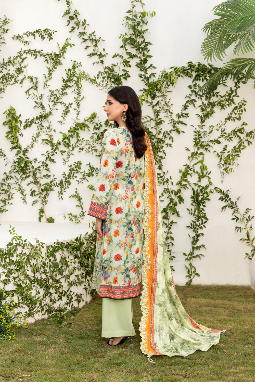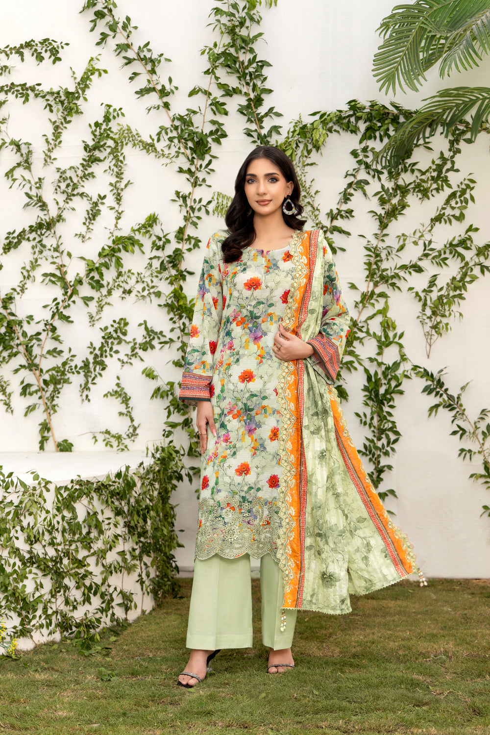 A soft GREEN outfit blooming with floral motifs — radiant and feminine.