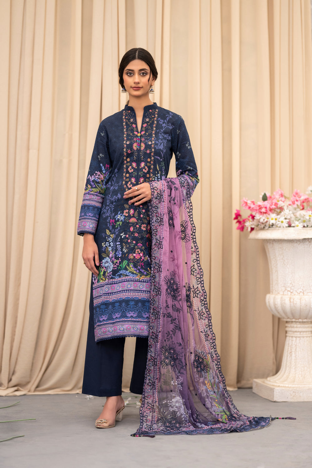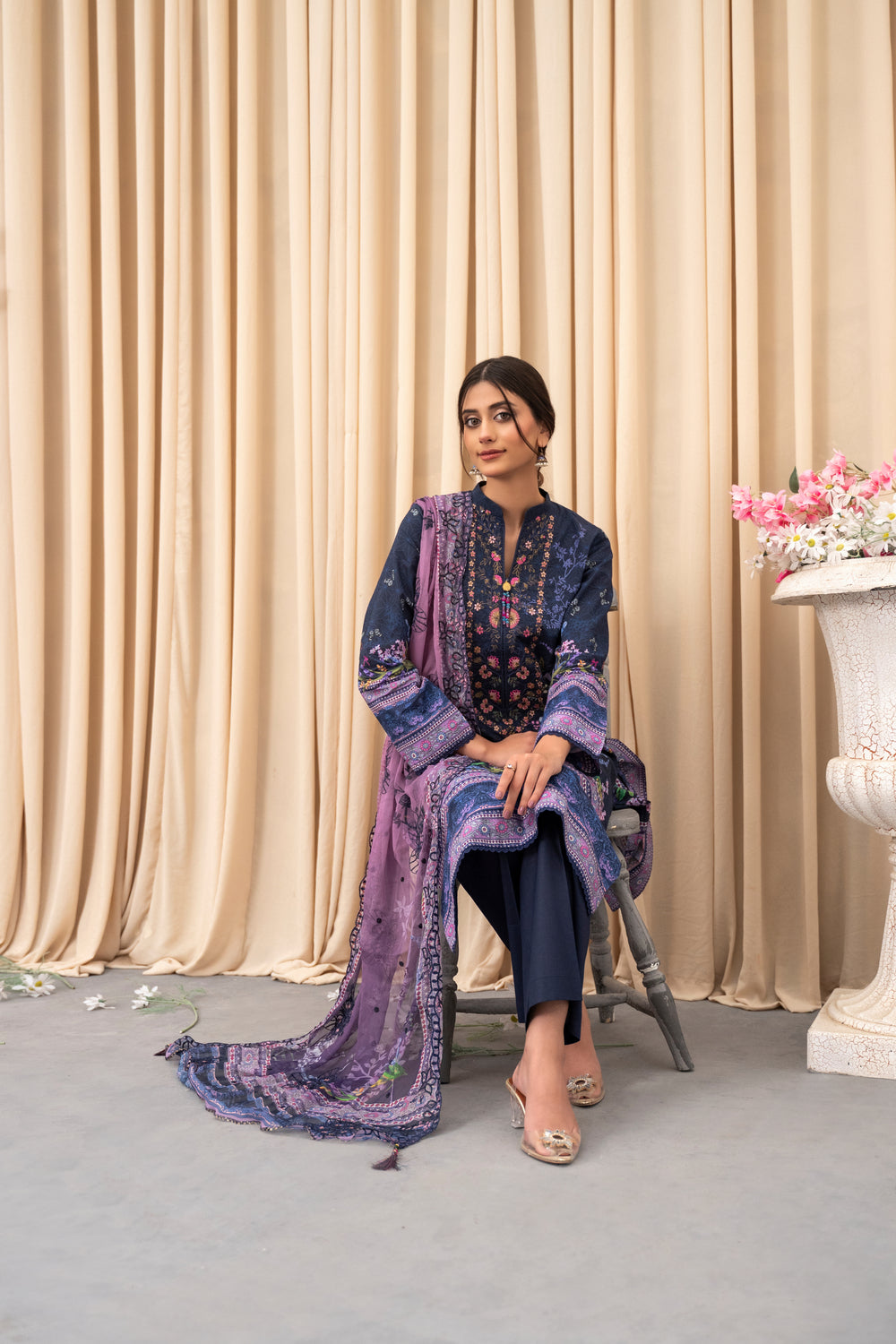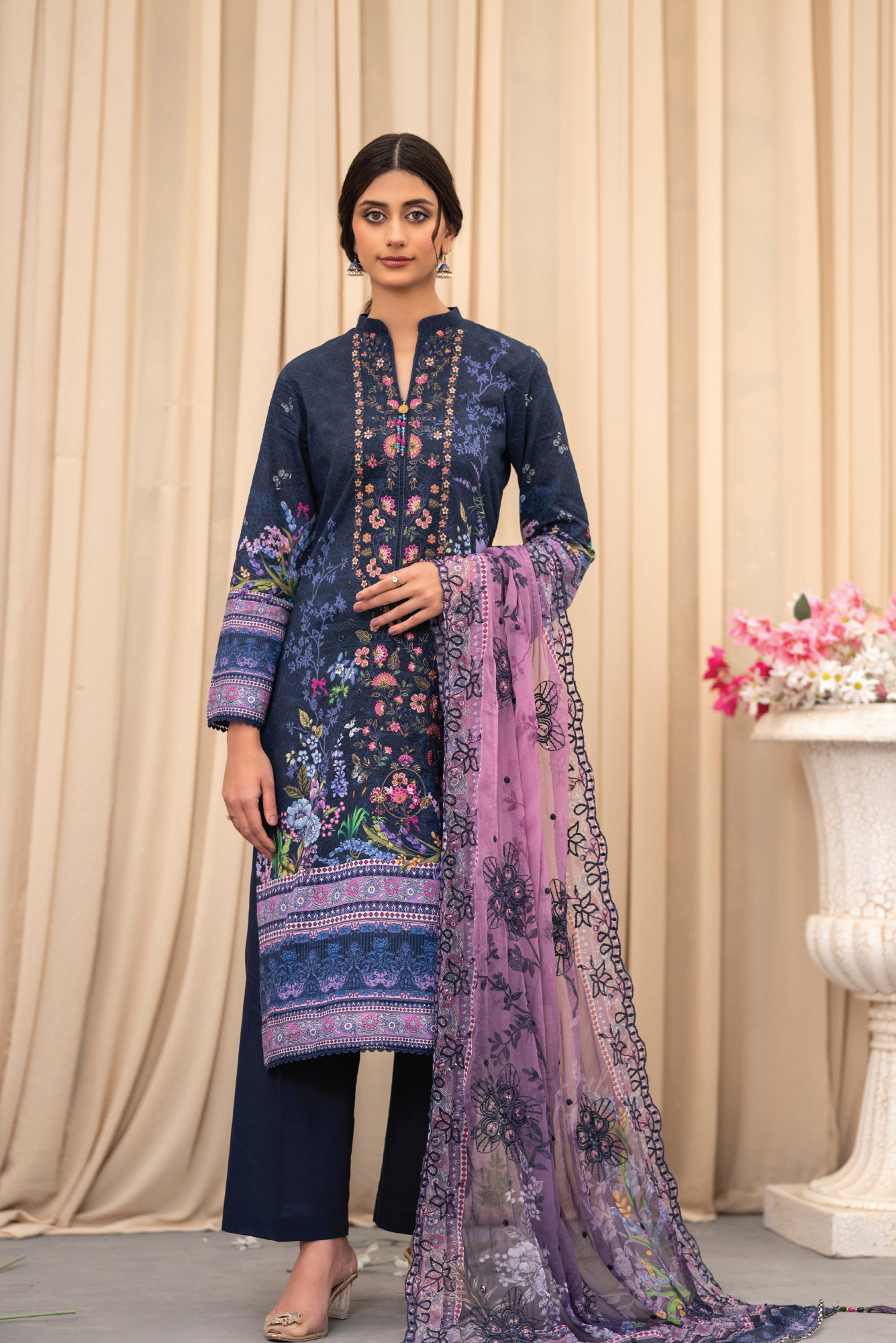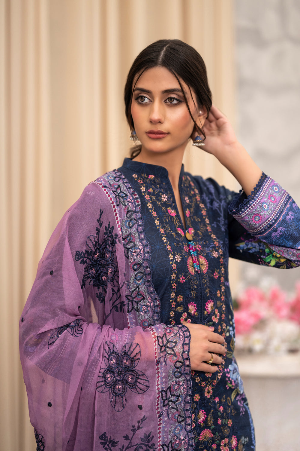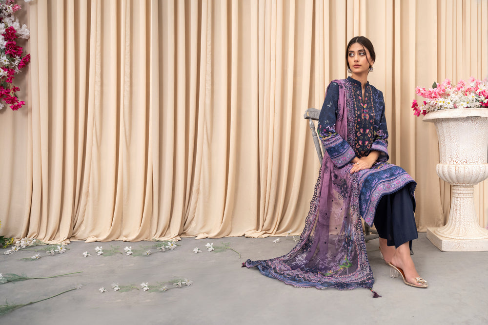 A navy blue beauty highlighted with artistic motifs and threadwork, making it ideal for evening wear.