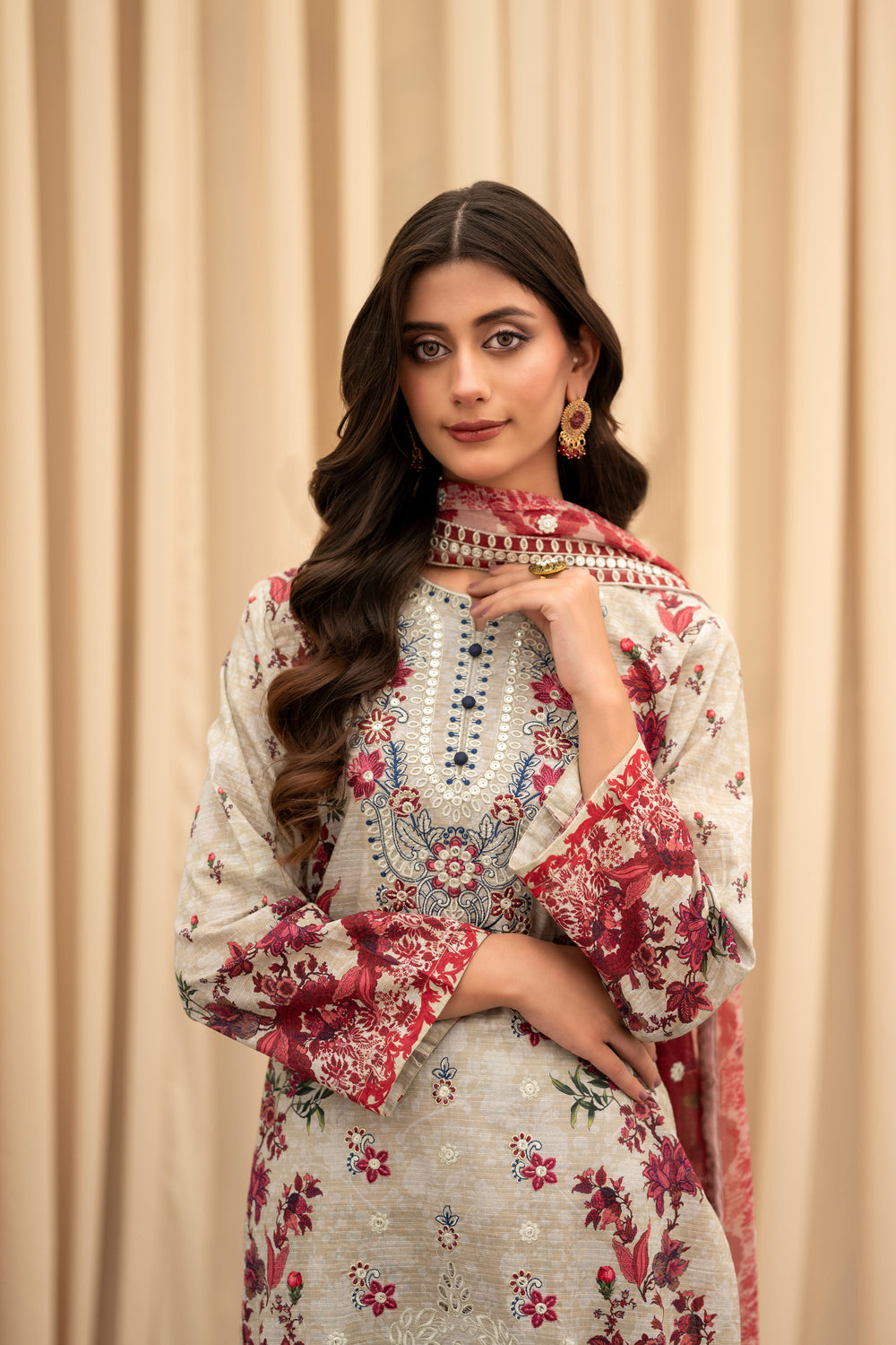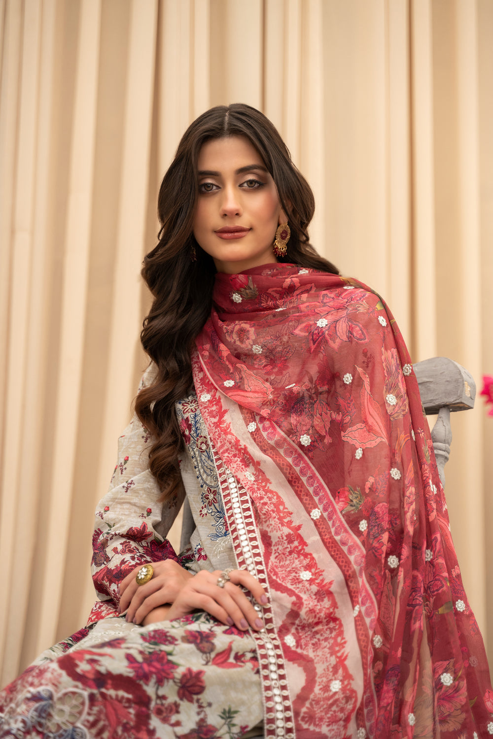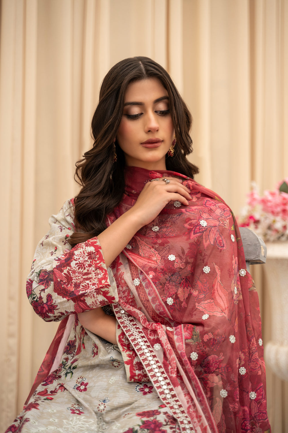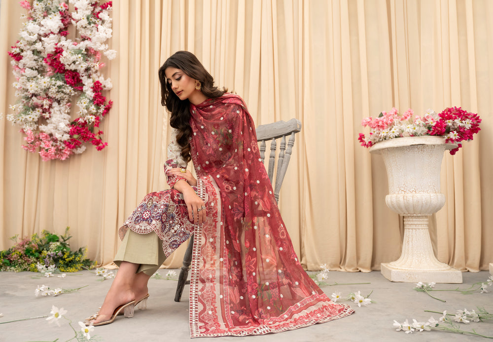 A romantic fusion of beige and deep red — detailed embroidery and a flowy dupatta add a regal finish.