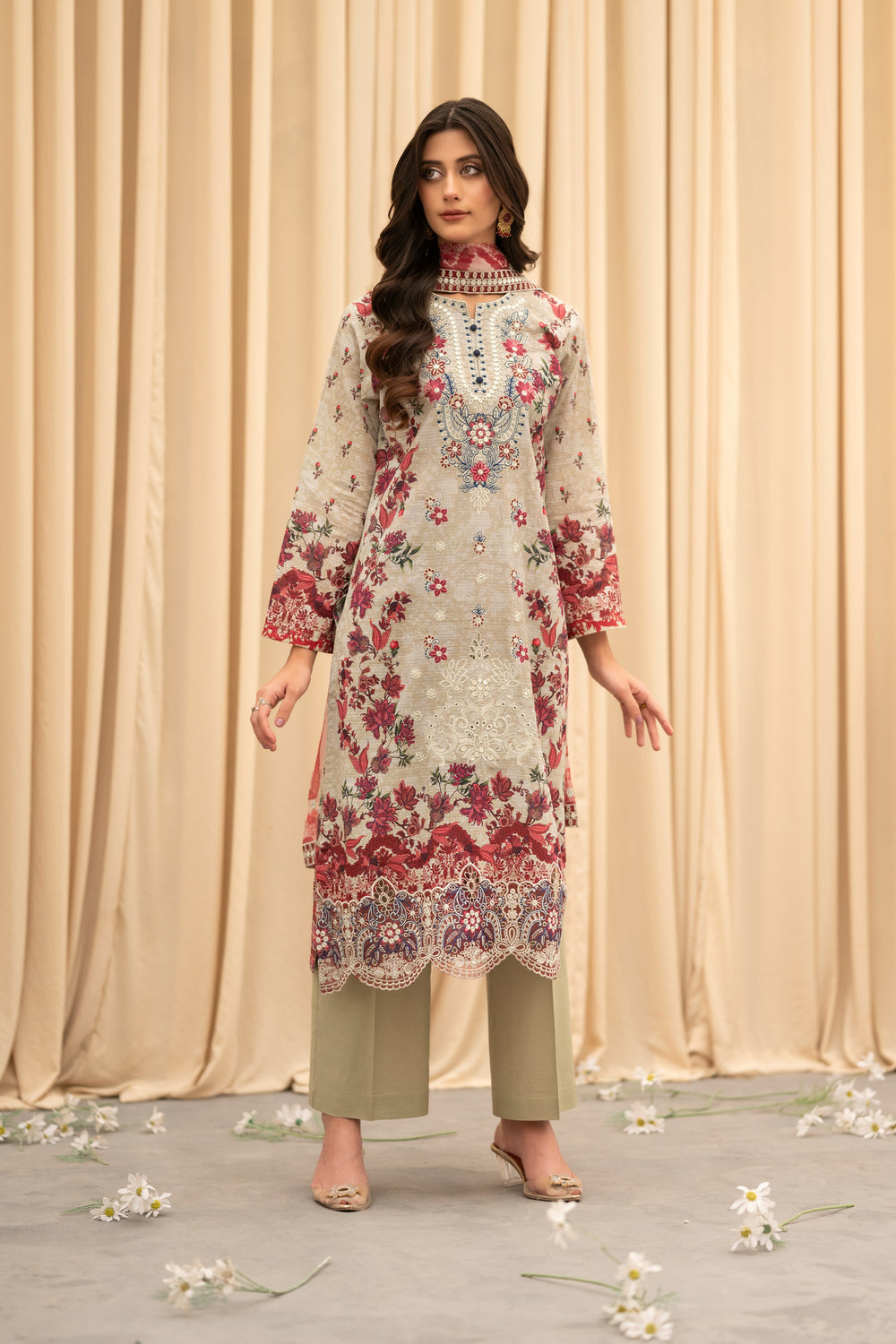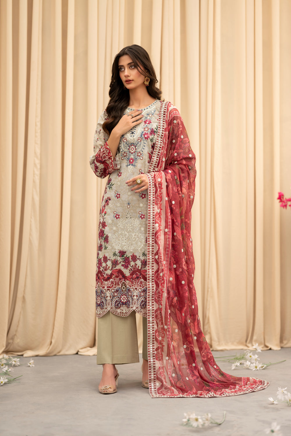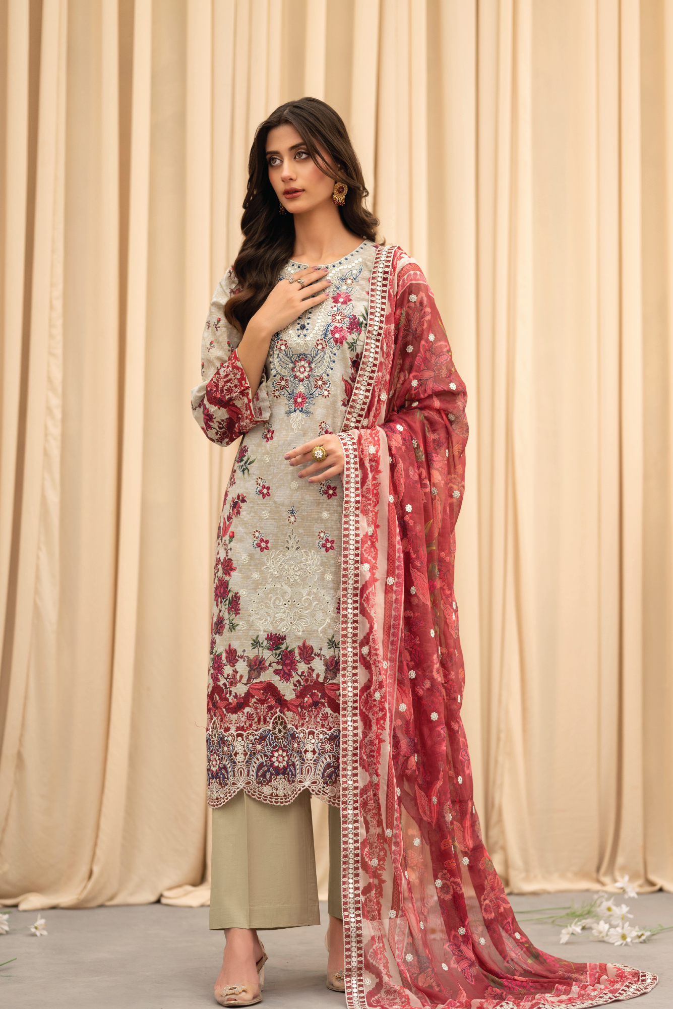 A romantic fusion of beige and deep red — detailed embroidery and a flowy dupatta add a regal finish.