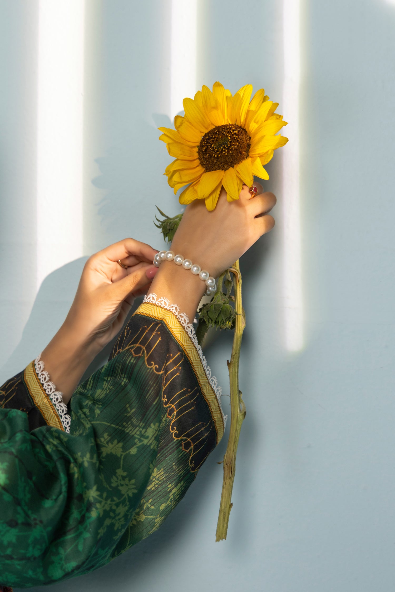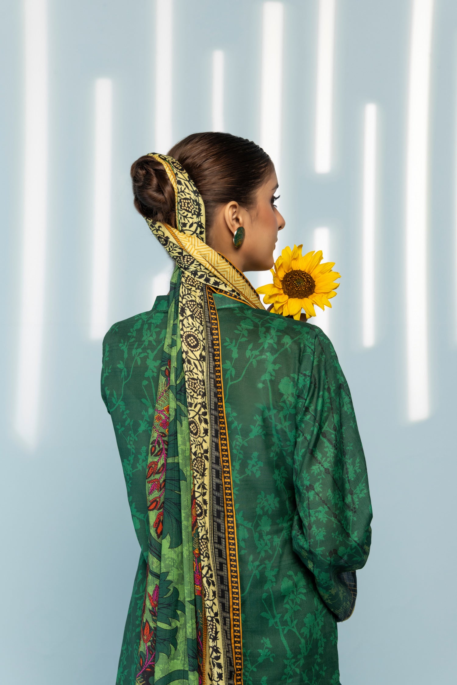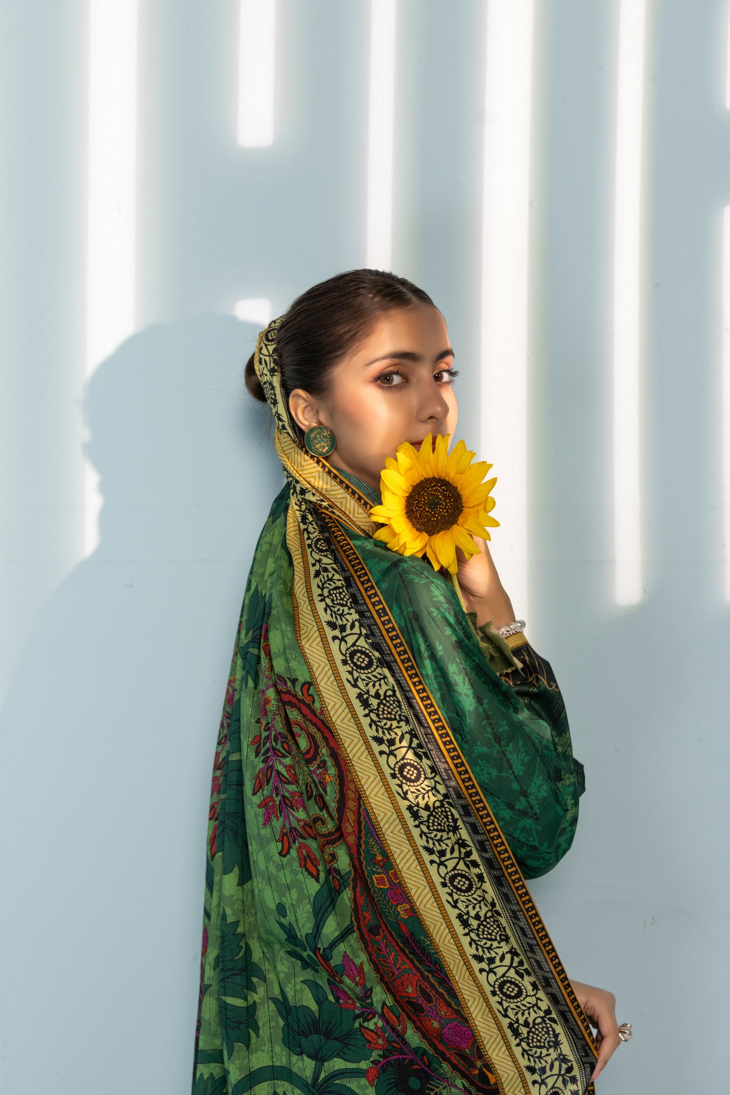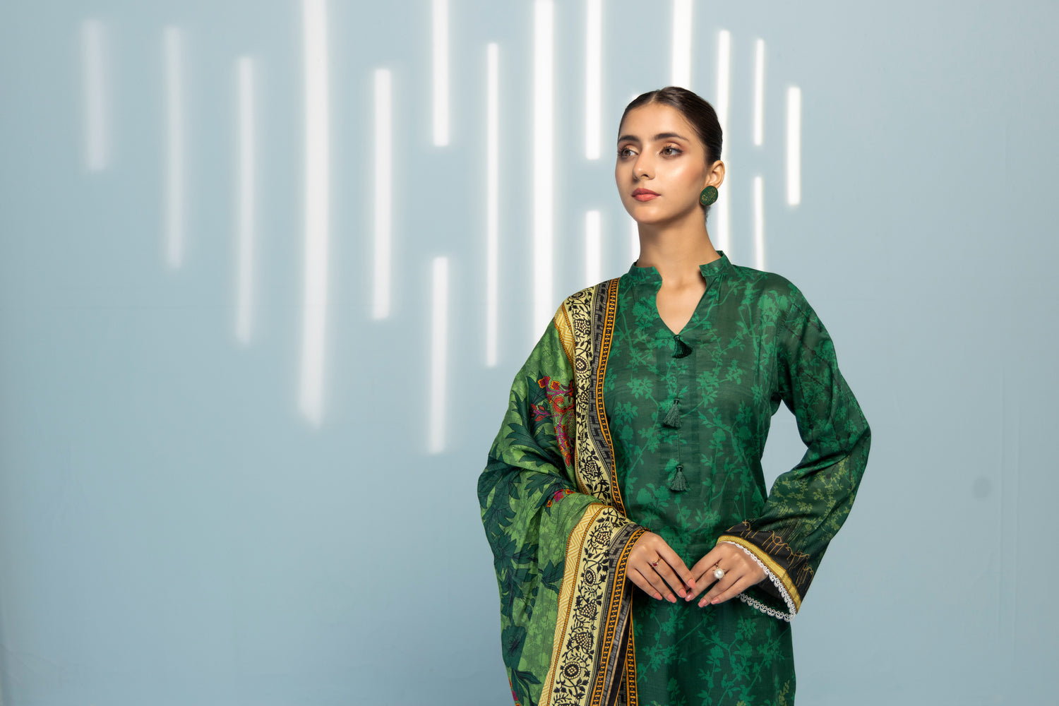 A  captivating blend of deep green tones, exquisite detailing and a beautifully adorned dupatta, perfectly complemented by a structured trouser.