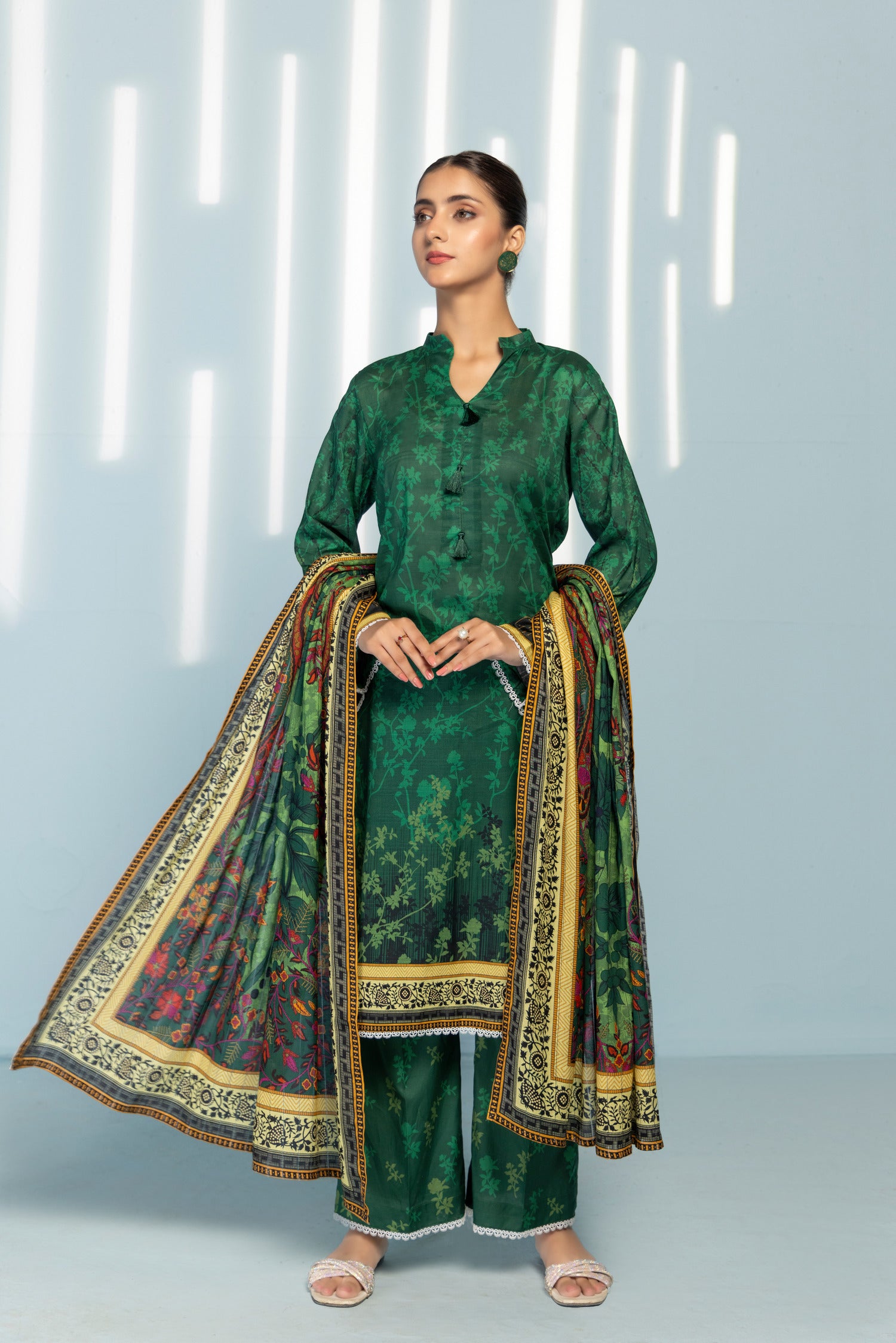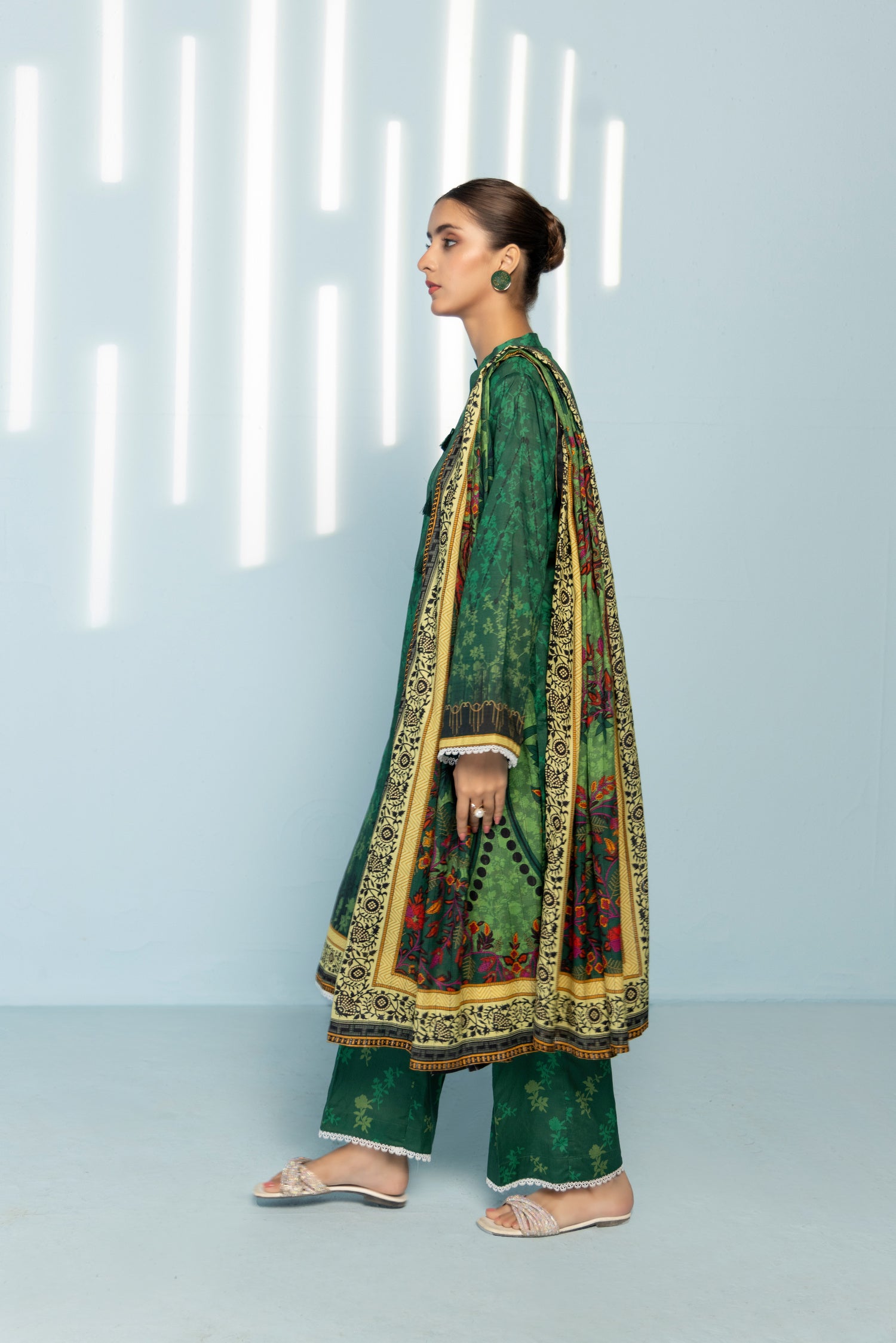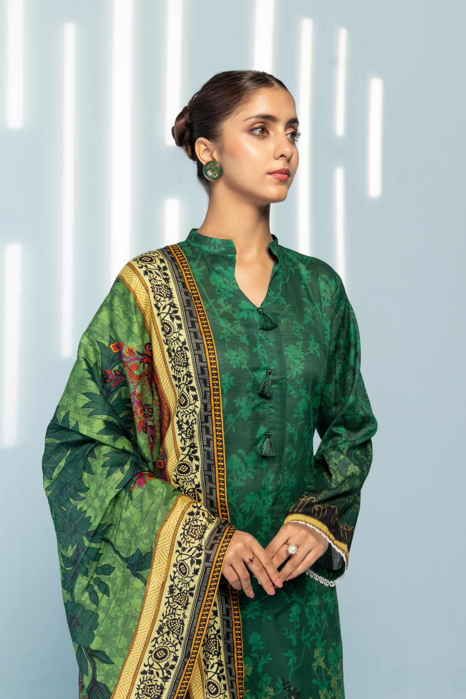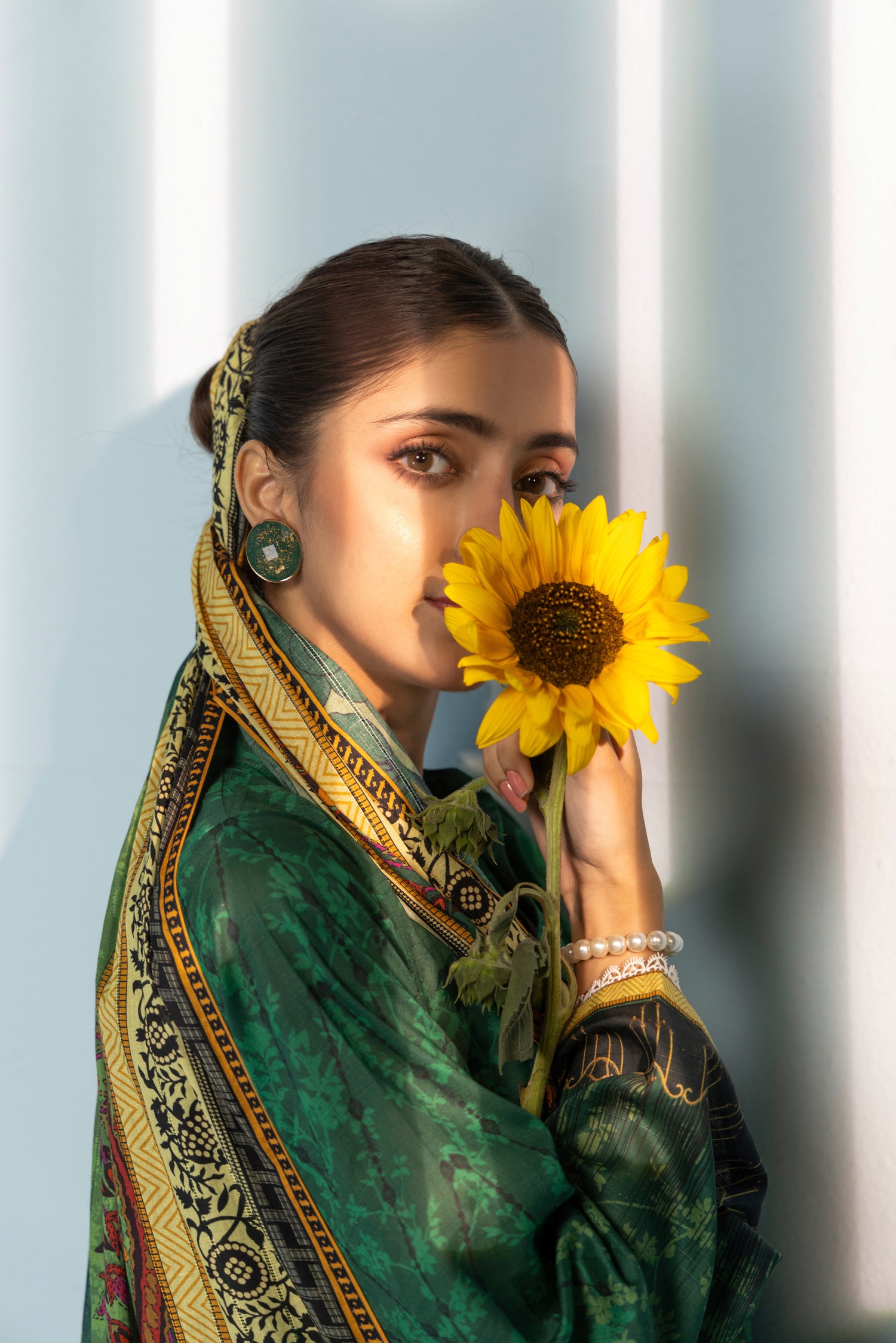A  captivating blend of deep green tones, exquisite detailing and a beautifully adorned dupatta, perfectly complemented by a structured trouser.