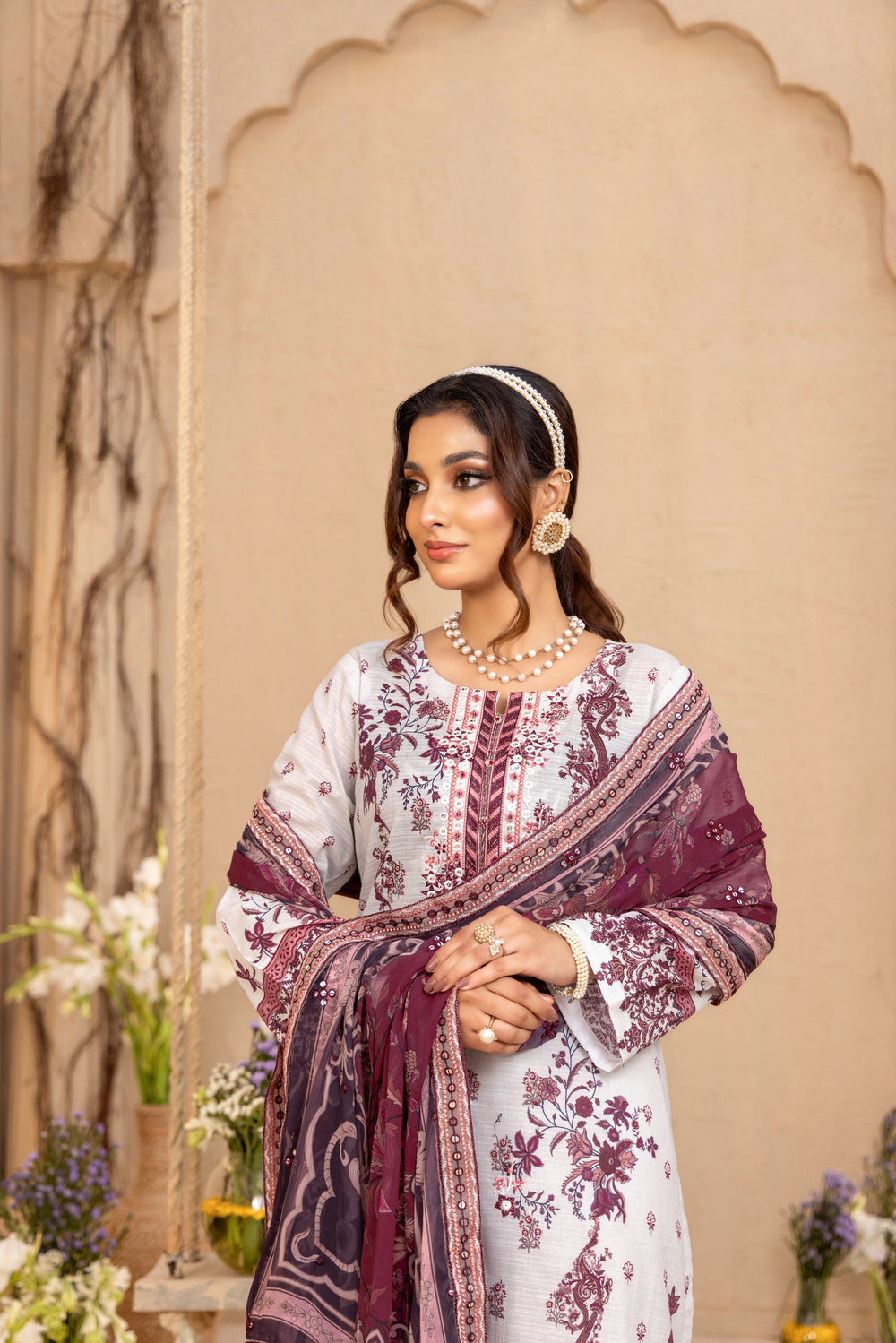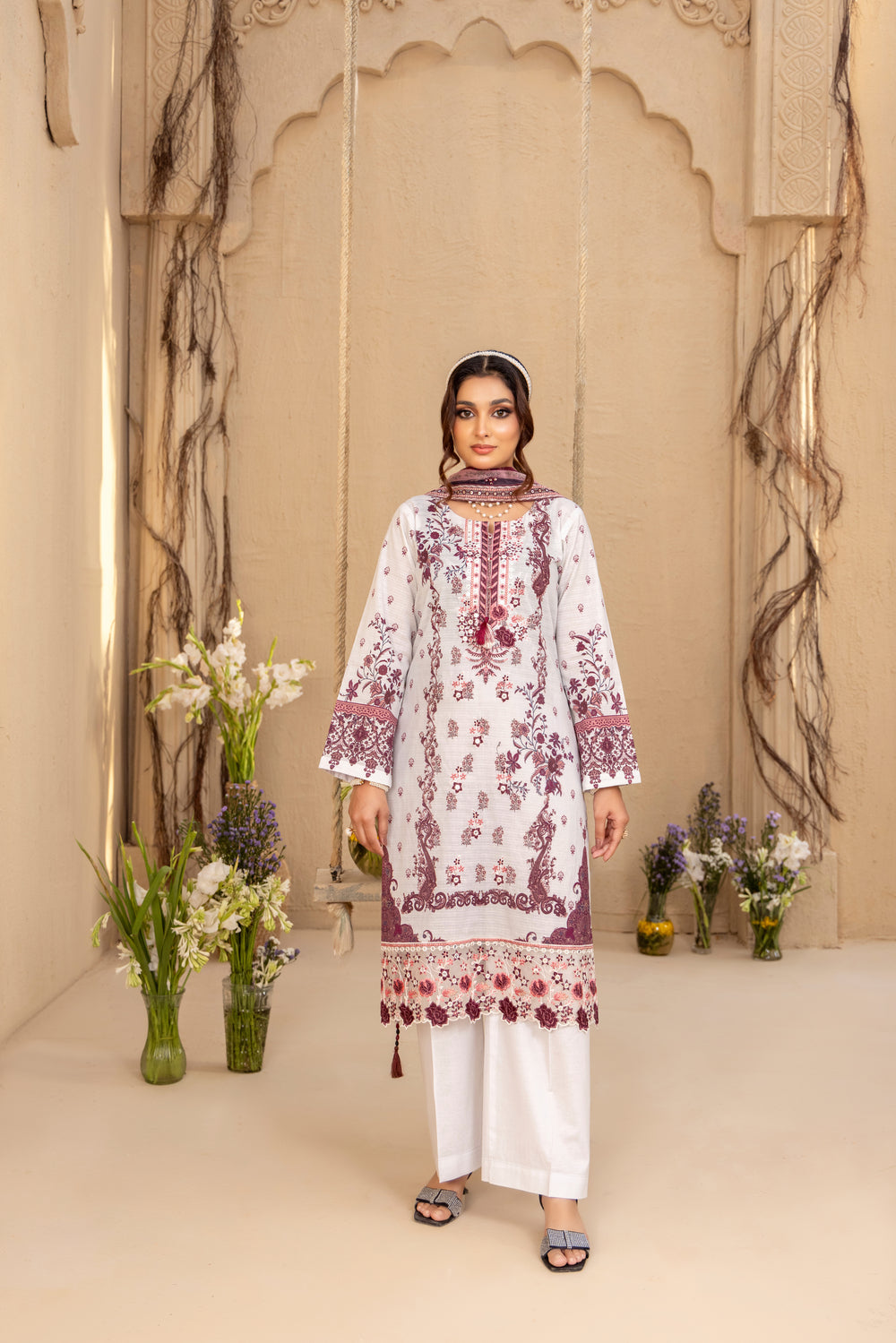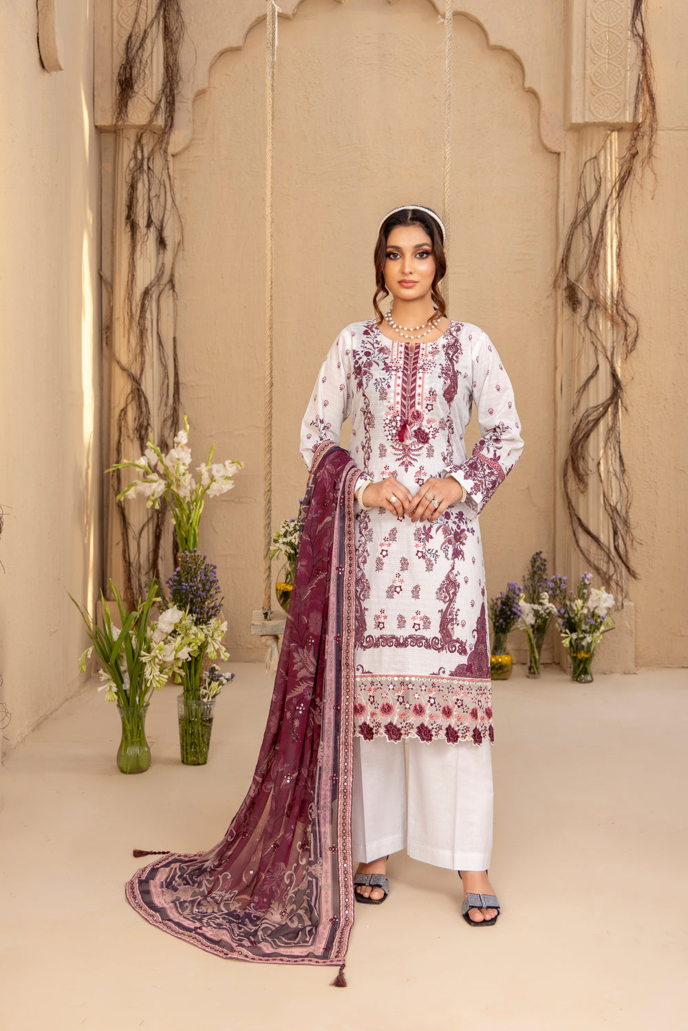 Blending classic patterns with a touch of contemporary flair, this ensemble in soft white and berry tones is designed to turn heads. From brunches to festive evenings — it’s your go-to statement look.