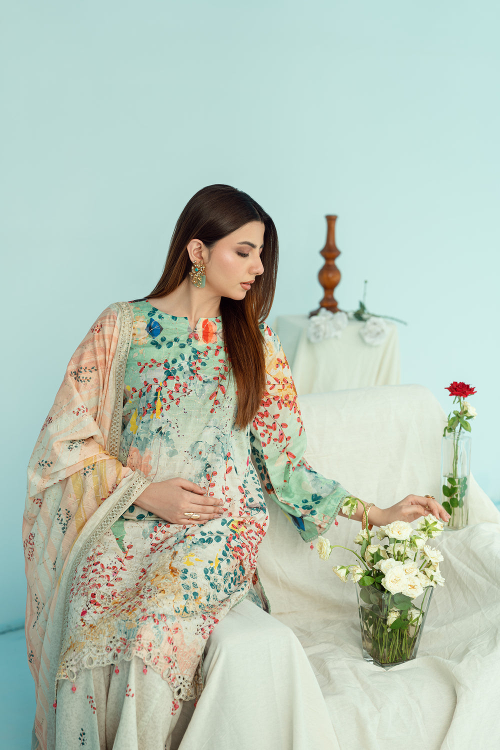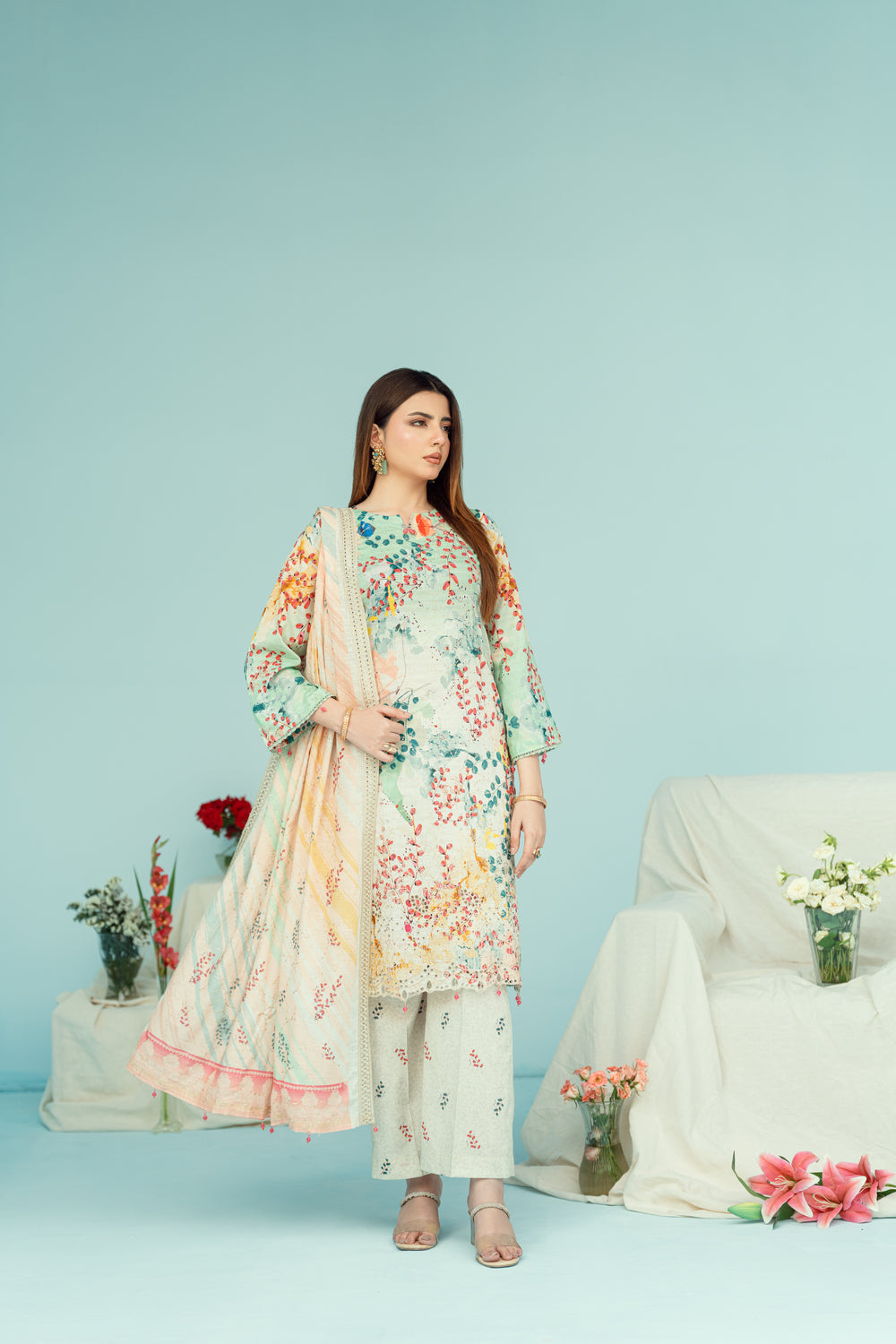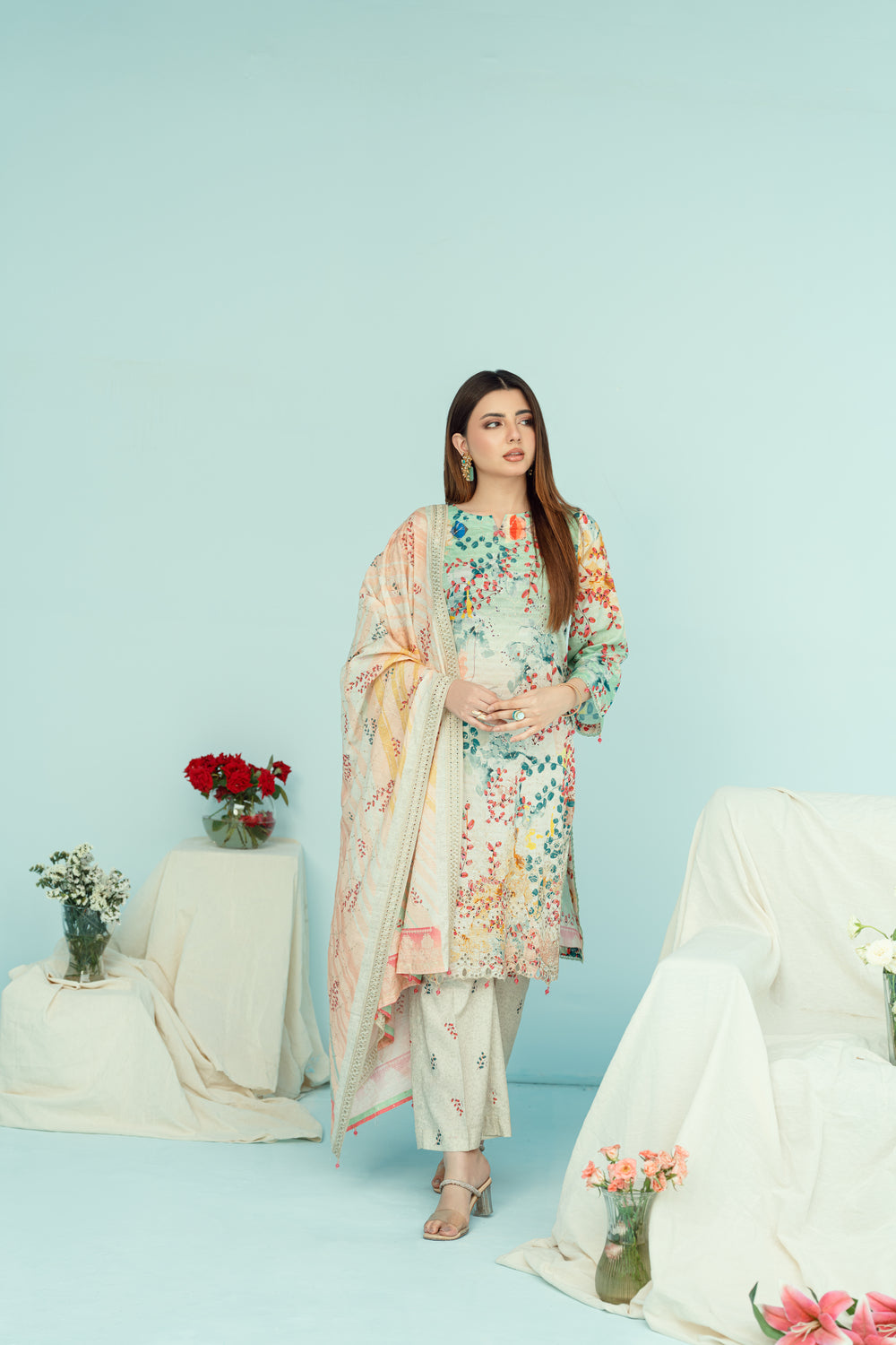 Step into grace with this cream and peach floral printed suit. The soft-toned kurta paired with straight trousers creates a chic silhouette, while the flowy printed dupatta adds a touch of charm. Perfect for casual gatherings and daytime elegance.