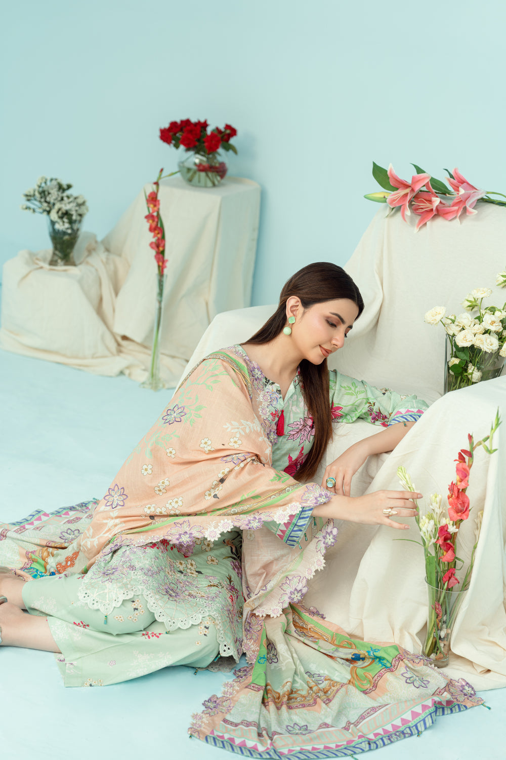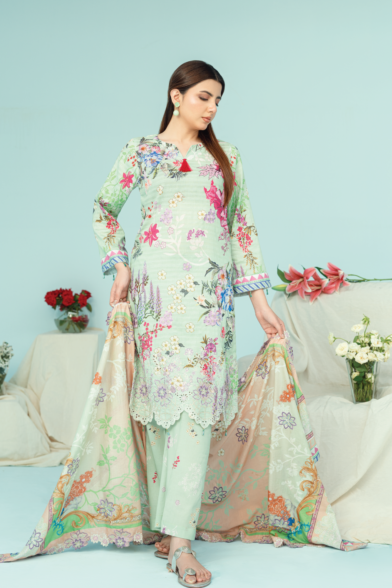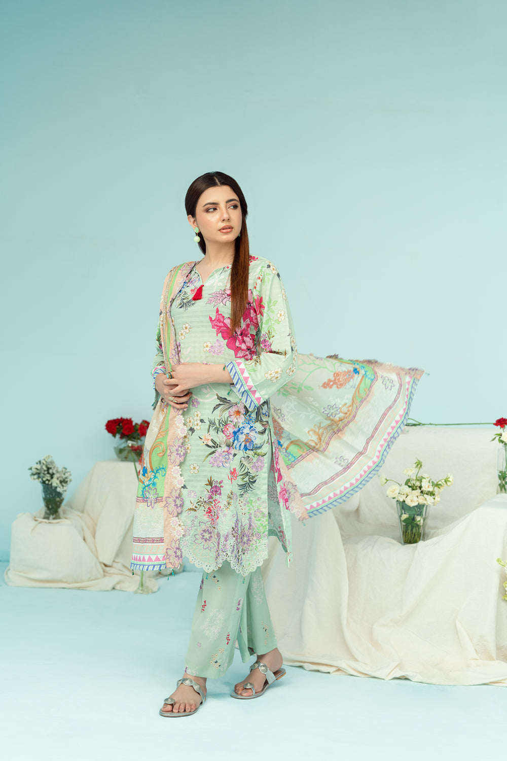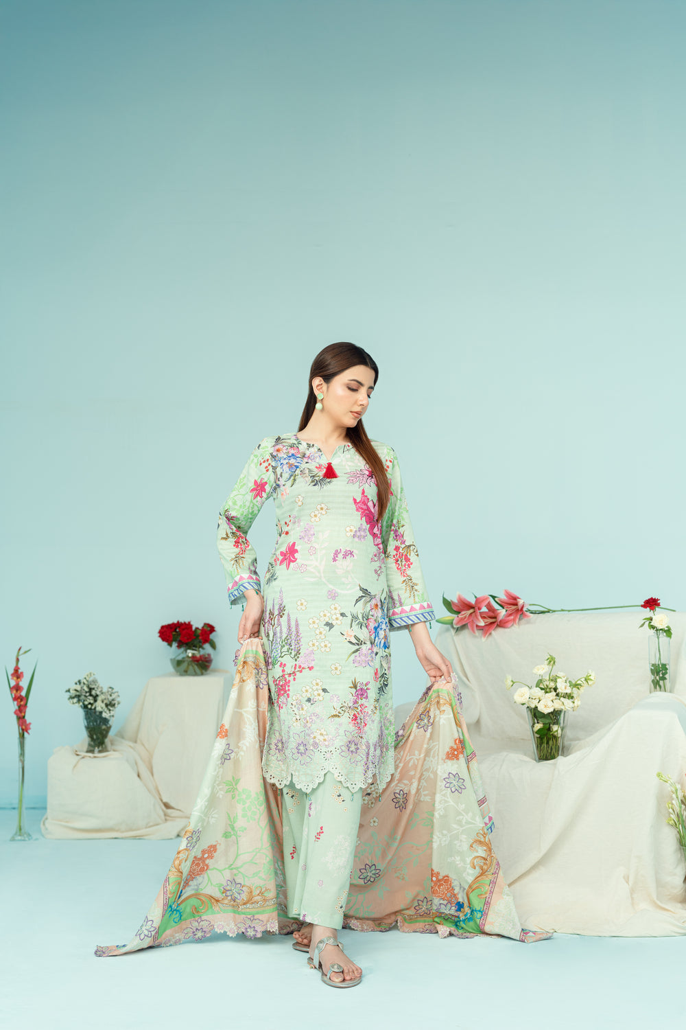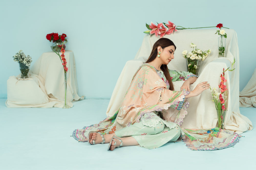 Delicate and dreamy, this pastel mint suit is adorned with soft floral prints for a feminine touch. Styled with matching trousers and a flowy printed dupatta, it’s a versatile pick for casual wear, tea parties, or semi-formal gatherings.